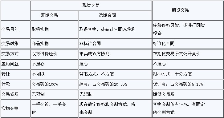 現貨交易,指買賣雙方在成交后立即履行交貨付款義務的交易方式。它與期貨交易不同的是,商品的品種、質量、數量等都不是標準化的。期貨交易,是指在交易所達成的、受法律約束、并規定在將來某一特定地點和時間交收某一特定商品的合約的交易行為。期貨合約都是標準化的,商品的等級、數量、交貨日期、交貨地點等都有統一的規定。