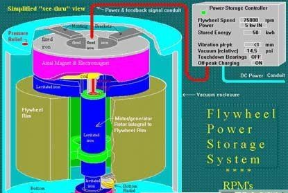 1994年,美國阿貢(ANL)國家實(shí)驗(yàn)室用碳纖維試制一個(gè)儲能飛輪:直徑38厘米,質(zhì)量為 11千克,采用超導(dǎo)磁懸浮,飛輪線速度達(dá)1000米/秒。它儲的能量可將10個(gè)100瓦燈泡點(diǎn)燃2~5小時(shí)。該實(shí)驗(yàn)室目前正在開發(fā)儲能為50千瓦小時(shí)的儲能輪,最終目標(biāo)是使其儲能達(dá)5000千瓦小時(shí)的儲能飛輪。一個(gè)發(fā)電功率為100萬千瓦的電廠,約需這樣的儲能輪200個(gè)。