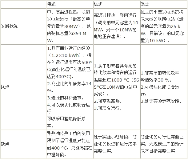 表2-1 三種聚光式太陽能電站的發展狀況及其優缺點