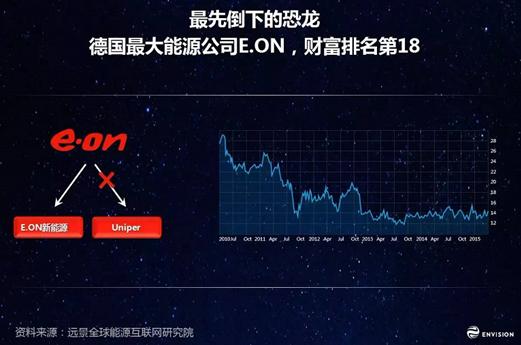 這些恐龍?jiān)趺礃恿耍吭诃h(huán)境已經(jīng)發(fā)生變化的德國,他最大能源公司E.ON是最先倒下的恐龍。E.ON在2014年年底就宣稱碰到了前所未有的挑戰(zhàn),面對兩個能源世界,一個是傳統(tǒng)的能源世界;另外一個是嶄新的能源世界。在傳統(tǒng)的能源世界,他們非常沮喪,新投的幾億美元的天然氣電站,可能在一年時間也就只有十幾天可以帶負(fù)荷發(fā)電。在這么一個氣候已經(jīng)變化的環(huán)境中,市場機(jī)制已經(jīng)在篩選出一些物種。