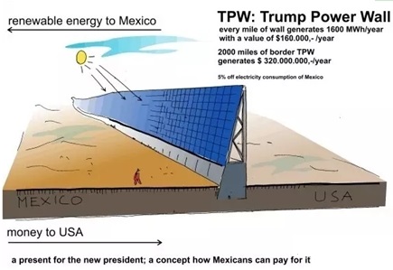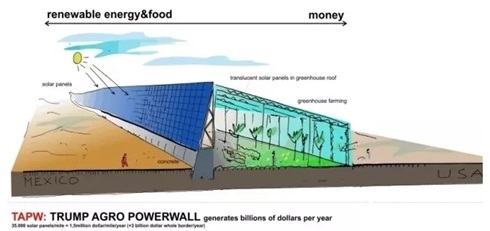 特朗普不是執(zhí)意要在美墨邊境建墻嗎?不是經(jīng)費(fèi)沒有著落嗎?荷蘭一家設(shè)計(jì)所(FARO)為特朗普總統(tǒng)獻(xiàn)計(jì)獻(xiàn)策,設(shè)計(jì)了Trump Power Wall(TPW),把這座分割兩國(guó)邊境的墻變成造福兩國(guó)的光伏墻。