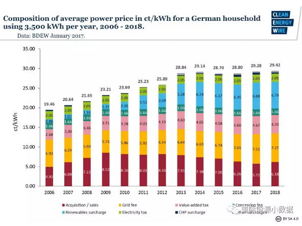 從2000年到2017年,隨著可再生能源的比重快速增長,德國可再生能源電價附加征收標(biāo)準(zhǔn)從每千瓦時0.2歐分提高到了6.88歐分,占居民電價比例從1.4%提高到23.5%。2017年達(dá)到可再生能源電價附加的最高點,從此開始下降,2018年已經(jīng)下調(diào)至6.79歐分。