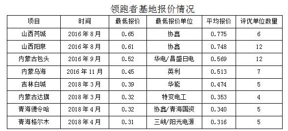 國家能源局為“促進(jìn)光伏發(fā)電技術(shù)進(jìn)步、產(chǎn)業(yè)升級、市場應(yīng)用和成本下降”,推進(jìn)光伏領(lǐng)跑者基地建設(shè)。2016年8月,在山西芮城基地招標(biāo)中,當(dāng)時當(dāng)?shù)氐墓夥鼧?biāo)桿電價0.85元/千瓦時,協(xié)鑫報出了最低價0.65元,6家評優(yōu)單位平均報價0.775元;在此后陽泉基地項目上,協(xié)鑫再次報出了0.61元的低價。今年4月,協(xié)鑫和青海國資在青海德令哈基地報價0.32元,5家評優(yōu)單位平均電價0.34元,而當(dāng)?shù)毓夥鼧?biāo)桿電價0.55元;此后比鄰的青海格爾木基地,三峽和陽光報價只有0.31元,5家評優(yōu)單位平均電價0.316元,已經(jīng)低于青海燃煤火電平均上網(wǎng)標(biāo)桿電價0.3247元/千瓦時。
