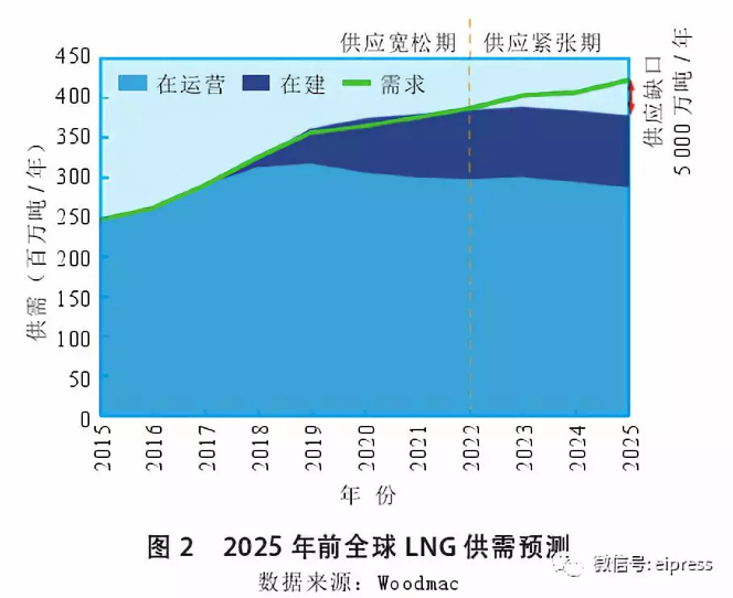 從目前全球正在運營和在建的LNG產能和未來的需求預期來看,短期內將不可避免地出現一定程度的供應過剩,伍德麥肯錫(Woodmac)認為這個時間點將會在2019年前后到來,到2022年左右結束供應寬松期,進入供應緊張期,見圖2.
