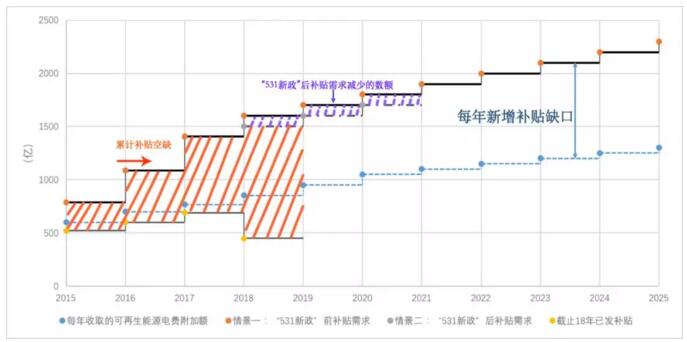 注:紫色區(qū)域?yàn)?ldquo;531新政”后近三年新建規(guī)模減少導(dǎo)致的補(bǔ)貼需求減少的金額,但累計(jì)補(bǔ)貼缺口(紅色區(qū)域)仍在擴(kuò)大。其中藍(lán)色虛線表示專(zhuān)用于補(bǔ)貼的可再生能源電費(fèi)附加總額,隨著發(fā)電量逐年增加收取的金額逐年增加。情境一的實(shí)線與藍(lán)色虛線之間表示了每年新增的補(bǔ)貼缺口。另,由于各來(lái)源的數(shù)據(jù)不一致,也無(wú)法取得比較權(quán)威的數(shù)據(jù),本圖中數(shù)據(jù)僅是推測(cè),僅作為趨勢(shì)參考。