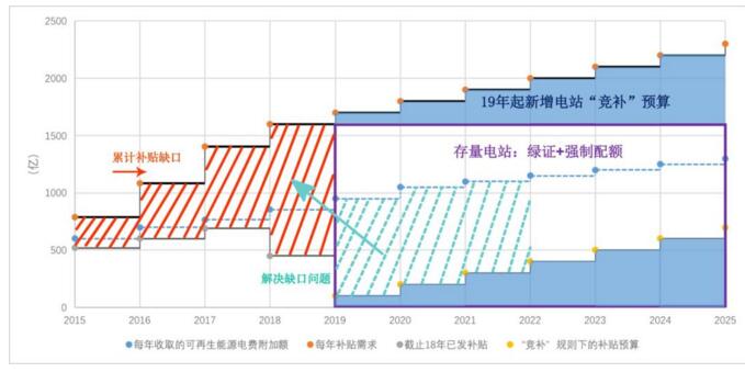 注:模型中,如果19年及以后新增電站全部采用“競(jìng)補(bǔ)”規(guī)則,各年“競(jìng)補(bǔ)”預(yù)算也從可再生能源電費(fèi)附加中撥付(圖中標(biāo)藍(lán)區(qū)域);剩余的電費(fèi)附加額度(圖中綠色虛線組成的區(qū)域)用于償還累計(jì)缺口(紅線區(qū)域);模型建議自2019年起,存量電站的補(bǔ)貼(紫色大框內(nèi)區(qū)域)由“綠證+強(qiáng)制配合”解決。另,再次說(shuō)明,圖中數(shù)據(jù)僅作為趨勢(shì)參考。