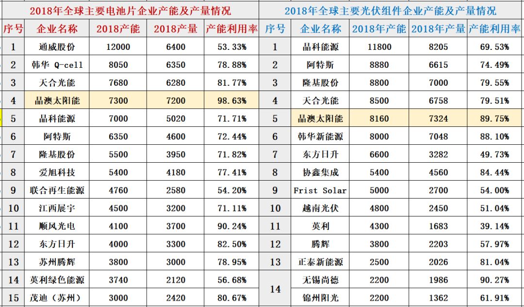 如你所知,“531新政”后,光伏行業規模效應和馬太效應越來越明顯,比如年產能低于5億片(約2.5GW)硅片的企業產能利用率僅能維持在50%左右,而年產能超過10億片(約5GW)的企業產能利用率保持在80%以上。據黑鷹光伏統計,晶澳太陽能2018年硅片、電池片、組件產能利用率分別為90.12%、98.63%和89.75%。