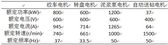 油田鉆機(jī)主要由起升系統(tǒng)、旋轉(zhuǎn)系統(tǒng)、循環(huán)系統(tǒng)、驅(qū)動(dòng)與傳動(dòng)系統(tǒng)、氣控系統(tǒng)和井控系統(tǒng)等組成,電氣設(shè)備主要有絞車、轉(zhuǎn)盤(pán)和泥漿泵等,驅(qū)動(dòng)方式一般為直流或交流電機(jī)驅(qū)動(dòng)。絞車是鉆機(jī)的核心部件,在鉆井過(guò)程中主要擔(dān)負(fù)起下鉆具、下套管、提取巖芯筒等,一般由交流變頻電動(dòng)機(jī)驅(qū)動(dòng)。ZJ70/4500DB為例,其主要電氣設(shè)備負(fù)荷如表所示。