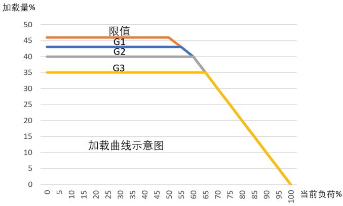 發(fā)電機(jī)組廠家一般會(huì)提供功率加載和減載曲線圖,下面的示意圖顯示了在規(guī)定的電壓和頻率限值以內(nèi),機(jī)組能夠加載的最大值。橫軸顯示當(dāng)前負(fù)荷率,縱軸顯示加載負(fù)荷率。例如,G2等級(jí)在圖上對(duì)應(yīng)的加載率是20%,也就是說(shuō)單步突加負(fù)荷在20%以內(nèi)時(shí),電壓或頻率波動(dòng)不會(huì)超過(guò)G2限值。