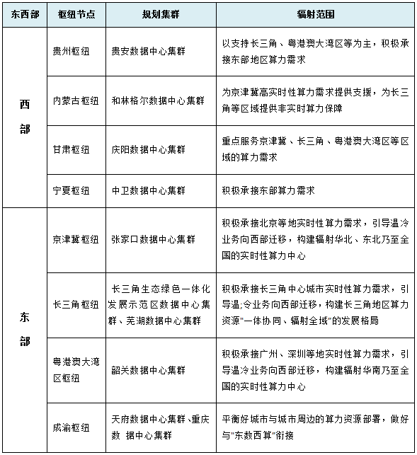 近日,國家發(fā)改委、中央網(wǎng)信辦、工業(yè)和信息化部、國家能源局聯(lián)合印發(fā)通知,同意在京津冀、長三角、粵港澳大灣區(qū)、成渝、內(nèi)蒙古、貴州、甘肅、寧夏等8地啟動建設(shè)國家算力樞紐節(jié)點,并規(guī)劃了10個國家數(shù)據(jù)中心集群。至此,全國一體化大數(shù)據(jù)中心體系完成總體布局設(shè)計,“東數(shù)西算”工程正式全面啟動。
