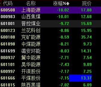 截至收盤,煤炭股整體暴跌。前期漲幅較高的煤炭股跌幅較深,上海能源、山西焦煤跌停,晉控煤業、兗礦能源、潞安環能、冀中能源等股跌幅都在7%以上。