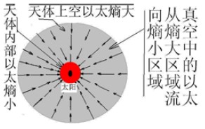 因?yàn)樘柡鸵磺刑祗w都是由以太結(jié)晶成的粒子組成,所以一切天體內(nèi)的以太熵,都比真空中自由以太熵小。參照熱力學(xué)第二定律,在系統(tǒng)空間內(nèi),能量或物質(zhì)粒子會從熵大的空間流向熵小的空間。那么太陽上空的以太就會徑向流向太陽的中心,這徑向以太流就成了引力場。如圖一所示