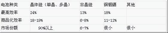 太陽能光伏發電技術作為太陽能利用中最具意義的技術,成為世界各國競相研究應用的熱點。最近10年以每年平均30%的速度遞增,最近3年更是以每年50%以上的速度高速增長。太陽能光伏發電已經成為可再生能源領域中繼風力發電之后產業化發展最快、最大的產業。目前,光伏發電中的太陽能電池仍然是以晶體硅太陽電池為主,一枝獨秀、市場份額達90%,大面積商品化太陽電池效率可達到18-19%。其次是非晶硅薄膜太陽電池發展迅速,市場份額占到6-7%。其他的如CIGS、砷化鎵等處于產業化的初期,市場份額較小(參見下表)。