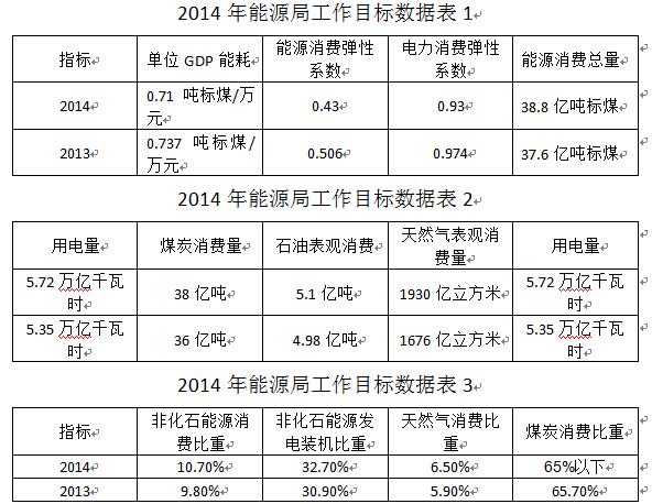 2014年能源工作目標中擬定,能源消費總量38.8億噸標準煤左右,增長3.2%;單位GDP能耗0.71噸標準煤/萬元,比2010年下降12%;能源消費彈性系數達到0.43左右;非化石能源消費比重提至10.7%,天然氣占一次能源比重達到6.1%,煤炭降至65%以下。