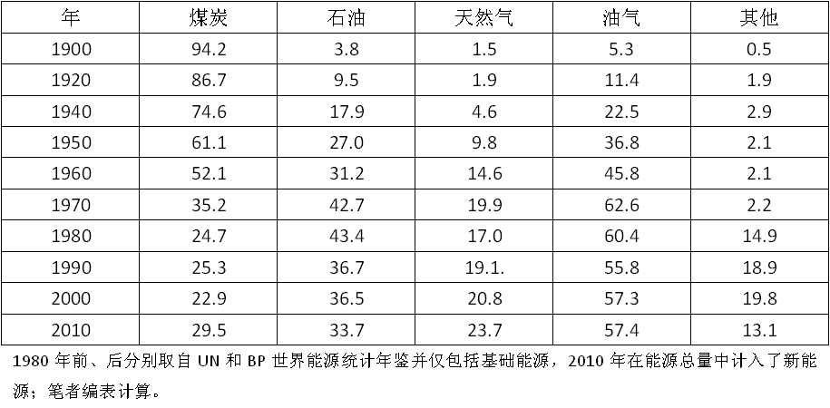 Petroleum是由拉丁文Petra(巖石)和Oleum(油)兩詞組成,顯然指液態原油(oil)。但在西方社會和學術界也流行著其廣義含義:可以是地表和地下的氣態(天然氣)、液態(原油)、半固態和固態(重烴、瀝青和地蠟)的碳氫化合物(烴)及其衍生物[2]。在漢語中Petroleum多譯為石油,顯然僅取了其狹義概念;但在學術界(特別在與英文對照的專業性用語中)仍多用其廣義含義。本文中所稱的石油時代恰為廣義的石油。表1的顯示即使在2010年世界石油在能源中的比例也僅是略高于煤炭,遠未達到在能構成中占“明顯優勢”。但從廣義概念來說,從上世紀末以來(狹義)石油和天然氣所占比例己達60%左右,可以無愧石油時代的稱謂。