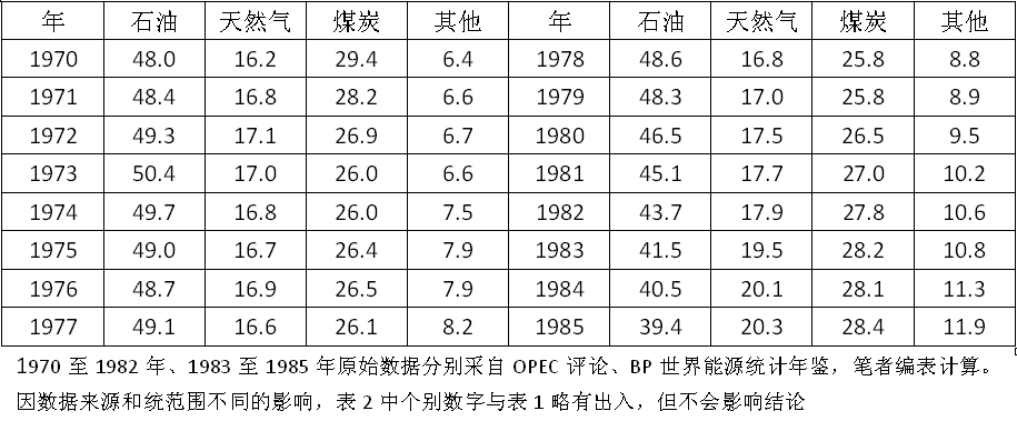 表2 1970至1985年第一、第二次石油危機前后世界基礎能源消費構成變化 %