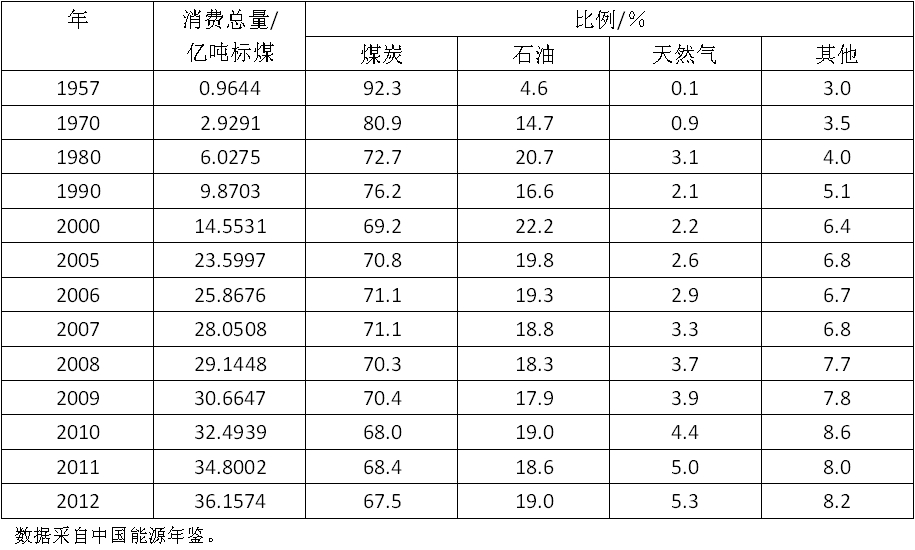 表3 中國1957至2012年一次能源消費構成變化 %