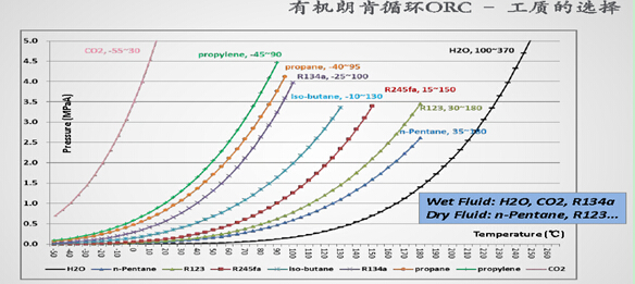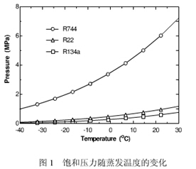 在環境溫度區間,二氧化碳的飽和蒸發壓力遠大于其它常規工質,采用二氧化碳工質節流回收膨脹功具有實質意義。右圖;二氧化碳(R744)與氟利昂(R22)、四氟乙烷(R134a)在環境溫度區間飽和壓力比較。二氧化碳熱泵可回收膨脹功相當于壓縮功的30%-40%。由于其特殊的勞倫曾循環(變溫熱源下的制冷循環),二氧化碳熱泵可以制造90℃熱水以及較大的溫差。例如,日本Eco-Cute系列熱泵可同時提供-9℃冷(鹽)水和65℃熱水,溫差74℃,單向能效4,雙向8。