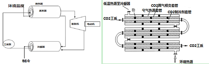 將CO2冷媒蒸發制冷作為太陽輻射能熱機T2,換熱效率成為關鍵。各種換熱器中,板式效率最高,超過90%。最小換熱溫差1℃??紤]到低溫可能引起結冰堵塞,可采用三套管式逆流換熱器。內套管供工質流動,中間套管為相變區(可充填相變材料),外套管引入環境熱并串聯冷凝器。工質蒸發導致中間套管發生相變,外套管導入環境熱源與中間套管換熱,獲得的低溫再與膨脹機排出的乏汽換熱,使之冷凝。