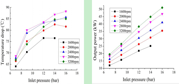 北京某大學研發的5KW單螺桿膨脹動力機,以壓縮空氣為工質,進氣壓力0.6MPa、轉速3000rpm工況下,總效率66%,汽耗率22.5kg/kW·h,最低排氣溫度-45℃。進氣壓力提高到1.6Mpa,最低排氣溫度-78.63℃,進出口溫差88℃。這表明膨脹機進口壓力越大,轉速越高,溫降、壓降和輸出越大。
