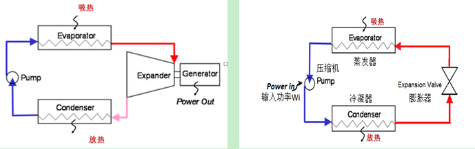 熱機循環投入化石燃料(或利用其它熱源)經鍋爐產生蒸汽推動汽輪機做功,一部分熱釋放給低溫熱源。自蒸汽機問世以來,所有的熱機循環,包括郎肯循環(以水為工質)以及采用低沸點工質的有機郎肯循環均以環境溫度為T2。為提高效率,只能單方向提高T1溫度。熱泵循環投入機械功,將熱從低溫熱源傳到高溫熱源。熱泵不是能量轉換過程,不受能量轉換效率極限限制,而是受逆卡諾循環效率制約。熱泵制熱能效比COP、制冷能效比EER(制熱/制冷量與實際運行功率之比)與環境溫度正相關。美國Waterfurnace7系列熱泵,在國際標準工況20℃時,COP為5.3。隨著技術進步,熱泵效率還會有所提高,更加接近COP15的理論效率。