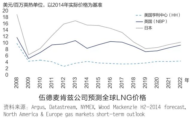 同時,中國與俄羅斯于2014年簽署大規(guī)模的管道氣購銷協(xié)議,將形成實際供應(yīng)能力,交易價格也將成為東亞各國天然氣采購價格的標(biāo)桿之一。綜合以上各種因素以及各可供資源的開發(fā)和運輸成本,伍德麥肯茲公司2014年預(yù)測,歐洲及北美天然氣價格期內(nèi)將基本保持穩(wěn)定,亞太地區(qū)氣價一路走低,最高價格在15美元/百萬英熱單位以下,期末可能到達(dá)10美元/百萬英熱單位左右的低點,觸底之后開始回升(見下圖)。