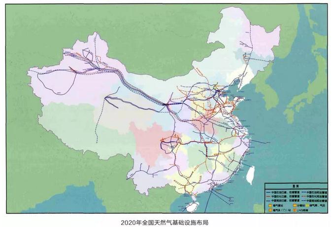 根據(jù)國家“十三五”規(guī)劃前期研究,到2020年,全國長輸管網(wǎng)總規(guī)模達(dá)15萬千米左右(含支線)(見下圖),輸氣能力達(dá)4800億立方米/年左右;儲氣設(shè)施有效調(diào)峰能力為620億立方米左右,其中地下儲氣庫調(diào)峰440億立方米、LNG調(diào)峰180億立方米;LNG接收站投產(chǎn)18座,接收能力達(dá)7440萬噸/年左右;城市配氣系統(tǒng)應(yīng)急能力的天數(shù)達(dá)到7天左右。