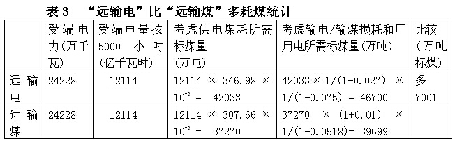 如果2020年要“遠輸電”2.49億千瓦,按廠用電7.5%,必須在煤炭基地裝26920萬千瓦空冷發電機組,按表2“遠輸電”損失為2.7%,共672.3萬千瓦,到達受端只剩24228萬千瓦。“遠輸煤”在南方按廠用電5.18%計算,建水冷機組25552萬千瓦機組即可得同等的24228萬千瓦電力,兩者差別1368萬千瓦。按表3所示,由于供電煤耗等差別,每年“遠輸電”比“遠輸煤”多耗標煤7001萬噸,多耗原煤7001×(7000/5000)=9801萬噸。