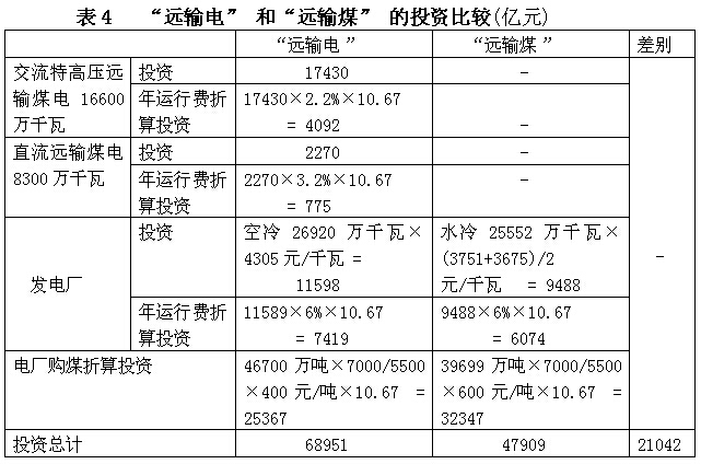 表4按全壽命管理理念計算結果,“遠輸電”比“遠輸煤”多浪費投資22050億元。