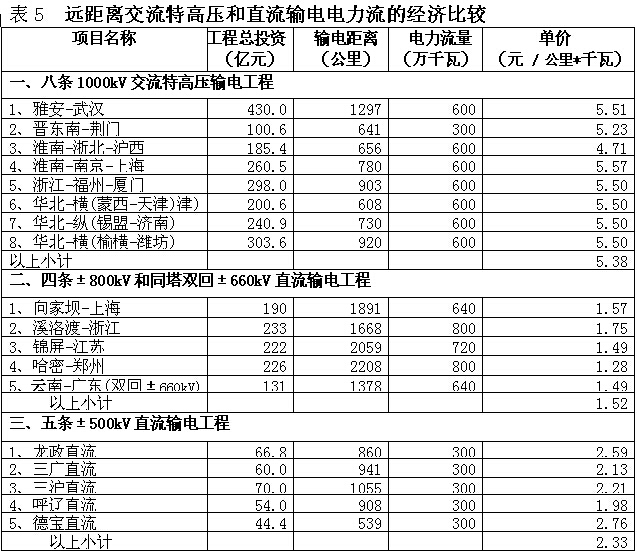 從表5遠距離交流特高壓和直流輸電電力流的經濟比較,交流特高壓實際工程和±800kV和同塔雙回±660kV直流輸電工程按同等電力流的單價比較為5.38/1.52=3.54倍;和±500kV直流輸電工程的單價比較為5.38/2.33=2.31倍。可見輸電距離愈長,交流特高壓愈不經濟。所以遠距離西電東送祗應采用直流輸電既經濟又安全。