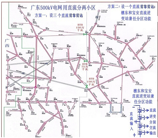 廣東應用直流再分兩個小區(qū),其中方案一設(shè)三個直流背靠背站,投資約30億元;方案二因運用直流逆變站兼任分區(qū)功能,祗增裝一個直流背靠背站,投資祗約10億元,都可徹底解決短路電流超標問題。