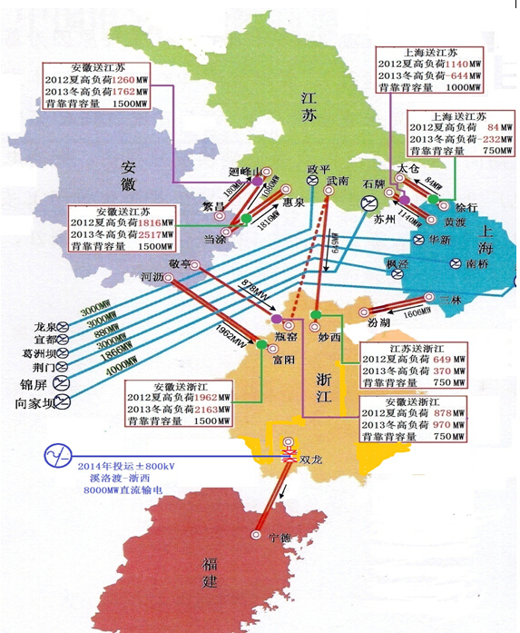 我國早已應用的[西北-華中][東北-華北]和[中-俄]黑河背靠背運行可靠,具備良好分區(qū)功能。圖2按華東省市間2012年夏季高峰/2013年冬季高峰調(diào)潮流(來自國網(wǎng)報告)研究直流背靠背的位置和容量,隨著電源/負荷的發(fā)展,所有省市間潮流應有減無增,以選擇其容量。