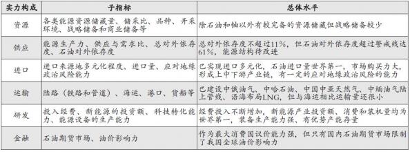 國家實力分為硬實力和軟實力。硬實力是支配性實力,是構成一國的經濟力量、軍事力量和科技力量的物質基礎。能源實力是國家硬實力的主要組成部分,它關乎國家安全和國家發展。能源實力有以下幾個組成要素:能源資源量,包括高儲采比的儲藏量以及戰略和商業儲備量;能源供應能力,能源對外依存度的大小決定了國家能源安全的自主性程度;能源進口力,即進口來源的多元化程度和年度進口量;對能源運輸主要通道的擁有量,包括鐵路、管道和海上運輸線以及聯接管道的港口與碼頭等;能源技術的研發力和能源設備的生產力;參與國際能源金融的程度(詳見表2)。