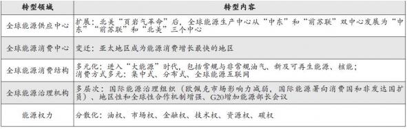 人類能源文明史上的第三次巨大轉型,以2014年底油價的一路狂跌為標志。這次從化石能源向非化石能源的轉型,與前兩次從木材到煤炭、從煤炭到石油的轉型一樣,將從根本上重塑全球能源秩序。幾乎所有的國家都需要在此過程中做出政策選擇,進行一場順應能源轉型方向的調整。對于以煤炭為主要消費品種的中國,能源革命的提出,是建立在對全球能源形勢發生變化的戰略判斷之上。中國全球能源戰略是為能源生產、能源消費、能源技術和能源體制革命服務的,因此需要厘清戰略實施所面對的現實環境。世界能源形勢轉型有以下特點(詳見表3):