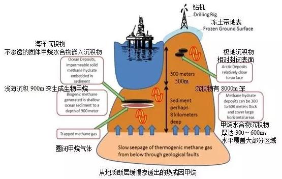 “天然氣水合物沉積”圖說明,生物甲烷在淺海沉積900米深處生成,而熱成因氣是從地質斷層緩慢滲透出來,生成極厚的可燃冰儲層。由于地殼變動,在極地和凍土帶也會埋藏豐富的可燃冰。