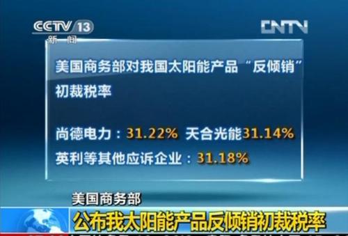 2012年5月17日(美國時間),美商務部公布對華太陽能電池產品反傾銷調查初裁結果,裁定中國涉案企業適用31.14%-249.96%不等的臨時反傾銷稅率,并將征稅措施向前追溯90天。商務部新聞發言人沈丹陽就此發表談話表示... [詳細]