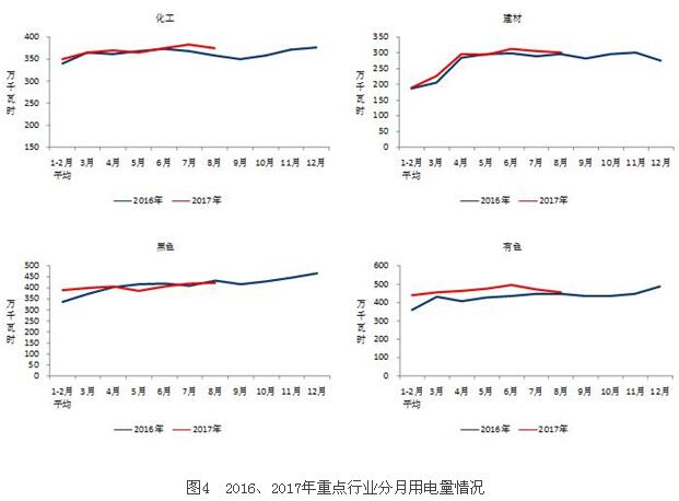 8月份,四大高載能行業(yè)用電量合計1552億千瓦時,同比增長1.8%,增速比上年同期提高1.4個百分點,占全社會用電量的比重為25.9%。其中,化工行業(yè)用電量375億千瓦時,同比增長6.3%,增速比上年同期提高9.2個百分點;建材行業(yè)用電量301億千瓦時,同比增長2.2%,增速比上年同期回落1.6個百分點;黑色金屬行業(yè)用電量421億千瓦時,同比下降2.3%,增速比上年同期回落0.7個百分點;有色金屬冶煉行業(yè)455億千瓦時,同比增長1.8%,增速比上年同期回落1.1個百分點。