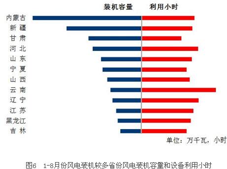 分類型看,1-8月份,全國水電設備平均利用小時為2304小時,比上年同期降低152小時。在水電裝機容量超過1000萬千瓦的7個省份中,除云南和四川其余省份水電設備平均利用小時同比均有不同程度降低,其中廣西、貴州和湖南降幅超過500小時,同比分別降低606、572和527小時,湖北和青海同比分別降低284和35小時;全國火電設備平均利用小時為2793小時,比上年同期增加67小時。分省份看,全國共有10個省份火電設備利用小時超過全國平均水平,其中,江蘇、河北、寧夏、山東、江西、陜西、安徽和內(nèi)蒙古超過3000小時,西藏和云南分別僅為66和823小時。與上年同期相比,全國共有23個省份火電利用小時數(shù)同比增加,其中,湖南和江西同比增加425和317小時,寧夏、湖北、陜西和廣東增加超過200小時,福建、浙江、貴州和河北增加超過100小時,而海南和北京同比降低超過300小時,同比分別降低342和304小時;全國核電設備平均利用小時4743小時,比上年同期增加105小時;全國風電設備平均利用小時1245小時,比上年同期增加101小時。