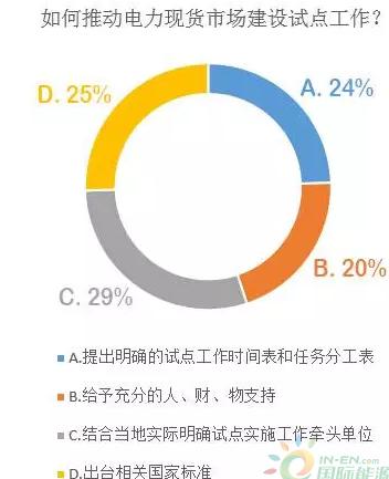 調(diào)查結(jié)果顯示,近三分之一的受訪者認(rèn)為,結(jié)合當(dāng)?shù)貙嶋H明確試點實施工作牽頭單位,是推動電力現(xiàn)貨市場建設(shè)的有力手段,此外,明確的試點工作時間表和任務(wù)分工表、充分的人力財力物力支持、相關(guān)國家標(biāo)準(zhǔn)也是建設(shè)電力現(xiàn)貨市場不可或缺的條件,在調(diào)查結(jié)果中所占比例相近。