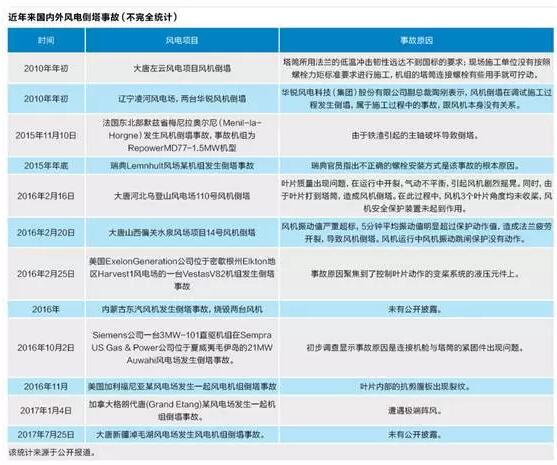2016年2月16日和2月20日,大唐河北烏登山風場和山西偏關水泉風場發生風機倒塔、造成設備損壞的事件。事后,大唐集團通報披露了兩起事故的原因。通報內容顯示,河北烏登山風電場110號風機倒塔事故的直接原因是葉片質量出現問題。山西偏關水泉風場項目14號風機倒塔,事故的直接原因是風機振動值嚴重超標,造成法蘭疲勞開裂,導致風機倒塔。