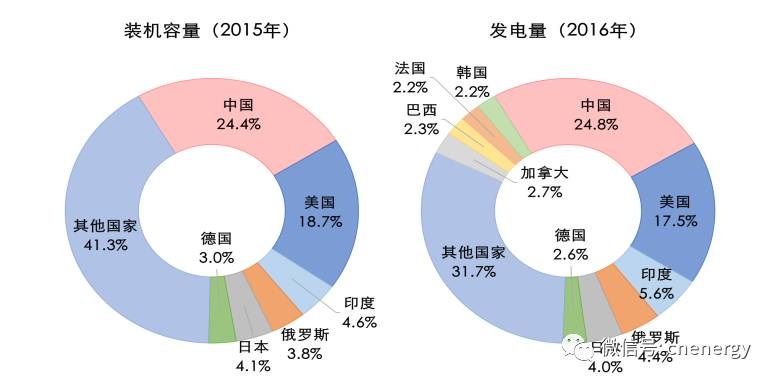 部分國家發電裝機和發電量占比情況