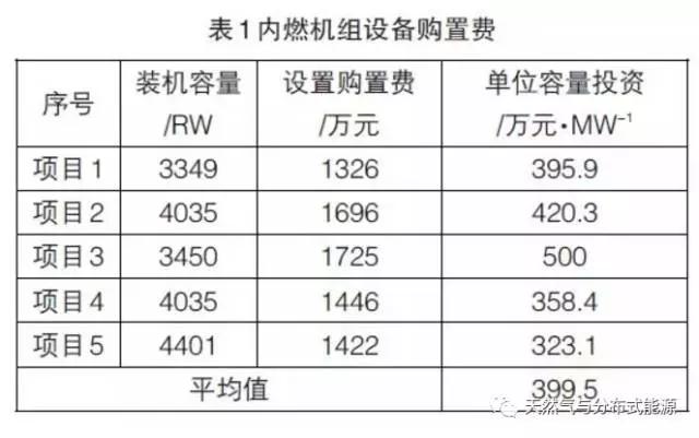 上海市現有的5個區域式天然氣分布式供能項目內燃機裝機容量及設備購置費用如表1所示,全市分布式供能系統發電機組單位容量投資參照該5個項目發電機組購置費的平均值(399.5萬元/MW)計取(400萬元/MW)。
