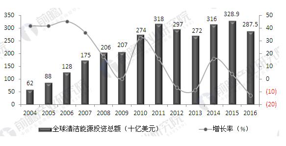 2004-2016年全球清潔能源投資總額(單位:十億美元,%)