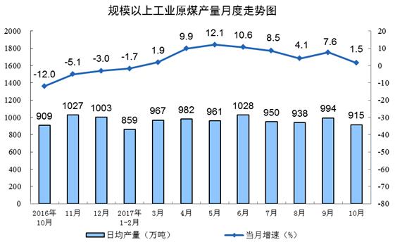 10月份,原煤產量2.8億噸,同比增長1.5%,增速比9月份回落6.1個百分點;日均生產914.7萬噸,比9月份減少79.1萬噸。1-10月份,原煤產量28.5億噸,同比增長4.8%。
