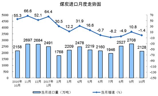 10月份,進口煤炭2128萬噸,同比下降1.4%,增速由正轉負,進口量比9月份減少580萬噸。1-10月份,進口煤炭2.3億噸,同比增長12.1%。