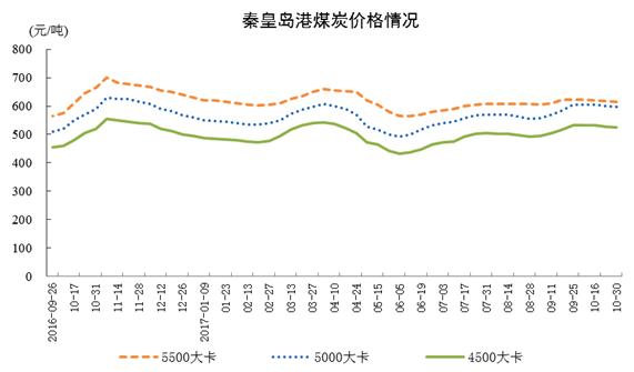 截至10月底,秦皇島5500大卡煤炭平倉價每噸616元,比9月底下降7元;5000大卡每噸598元,下降6元;4500大卡每噸526元,下降6元。