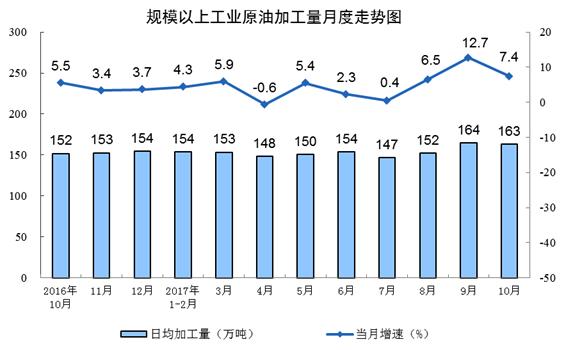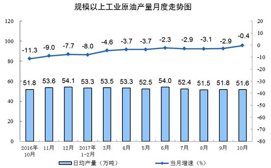 原油生產降幅收窄。10月份,原油產量同比下降0.4%,降幅比9月份收窄2.5個百分點;日均產量51.6萬噸,比9月份減少0.2萬噸。1-10月份,原油產量1.6億噸,同比下降4.1%。