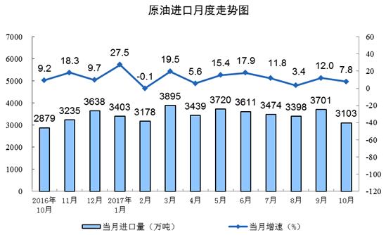 原油進口增速回落。10月份,進口原油3103萬噸,同比增長7.8%,進口量比9月份減少598萬噸,增速比9月份回落4.2個百分點。1-10月份,進口原油3.5億噸,同比增長11.8%。