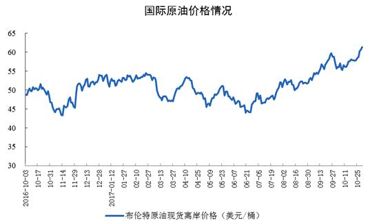 原油價格持續(xù)回升。10月份,布倫特原油現(xiàn)貨離岸價格穩(wěn)定在55美元/桶以上。截至10月31日,價格為61.4美元/桶,比9月底上漲4.3美元/桶。
