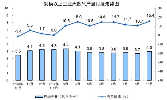 隨著“煤改氣”等工程的推進,天然氣需求旺盛,今年以來產量一直保持快速增長。10月份,天然氣產量124.1億立方米,同比增長15.4%,增速比9月份加快4.7個百分點;日均生產4.0億立方米,比9月份增加0.3億立方米。1-10月份,天然氣產量1211.2億立方米,同比增長9.7%。